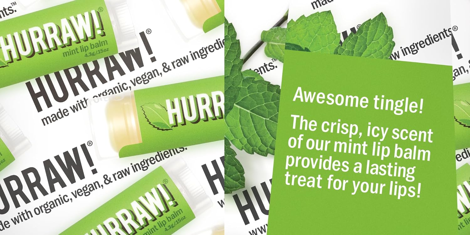 - THREE 4.8g/.17oz Oval Tubes of HURRAW! Lip Balm packaged in a white HURRAW! branded pillow box. GRAPEFRUIT (Zesty fresh! Let our pink grapefruit balm invigorate your senses.), MINT (Long lasting pepper-minty treat for your lips!), BLACK CHERRY TINTED (A gorgeous RED SHEER TINT is included for your kissers on this balm!). Made with certified organic, vegan, and raw ingredients. Hurraw! Lip Balms are certified 100% all natural origin, cruelty and gluten free. Non-GMO. Bee, Shea, Soy and Palm Free.