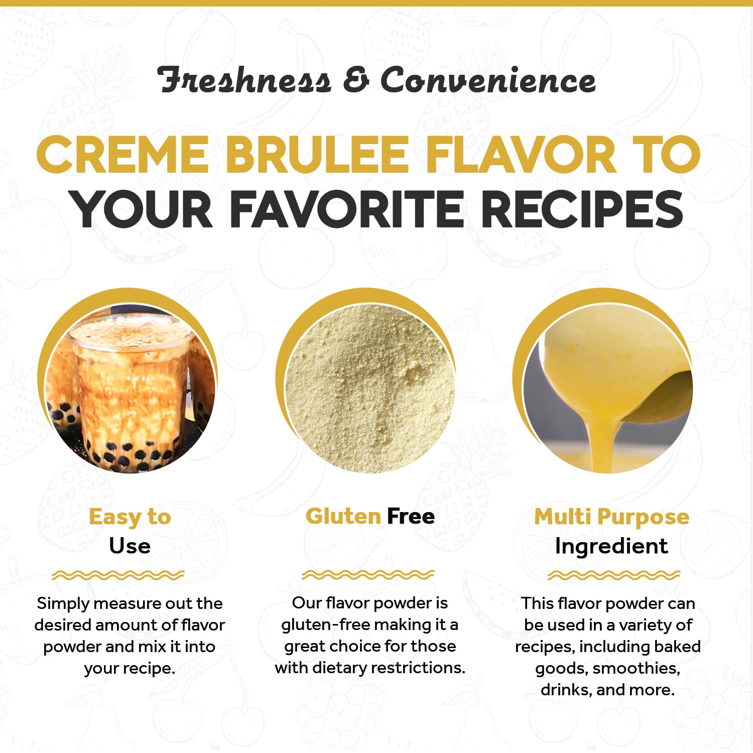 - ๐๐ฅ๐ฎ๐ญ๐๐ง-๐๐ซ๐๐ ๐๐ง๐ ๐ฏ๐๐ ๐๐ง: Our Creme Brulee flavor powder is gluten-free and vegan, making it a great choice for those with dietary restrictions. It's a versatile ingredient that can be used in a wide range of recipes, including ones that are gluten-free or plant-based.