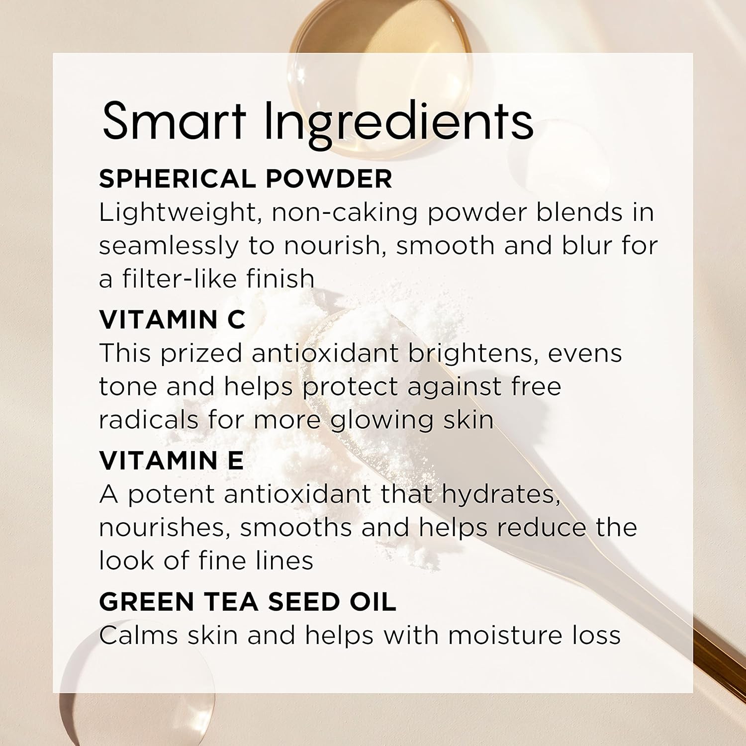 - INGREDIENT: SPHERICAL POWDER A lightweight, non-caking powder blends in seamlessly to nourish, smooth and blur for a filter-like finish VITAMIN C This prized antioxidant brightens, evens tone and helps protect against free radicals for more glowing skin VITAMIN E A potent antioxidant that hydrates, nourishes, smooths and helps reduce the look of fine lines GREEN TEA SEED OIL Calms skin and helps with moisture loss
