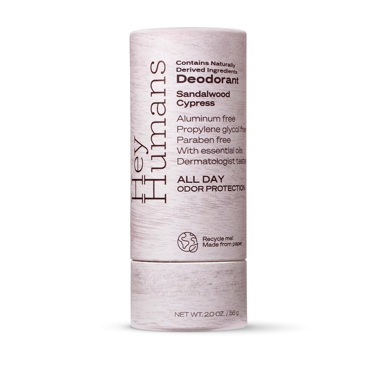 - Hey Humans deodorants are aluminum-free, paraben-free, phthalate-free, propylene glycol-free & silicone-free. They're also packaged in easily recyclabe paper for sustainability.