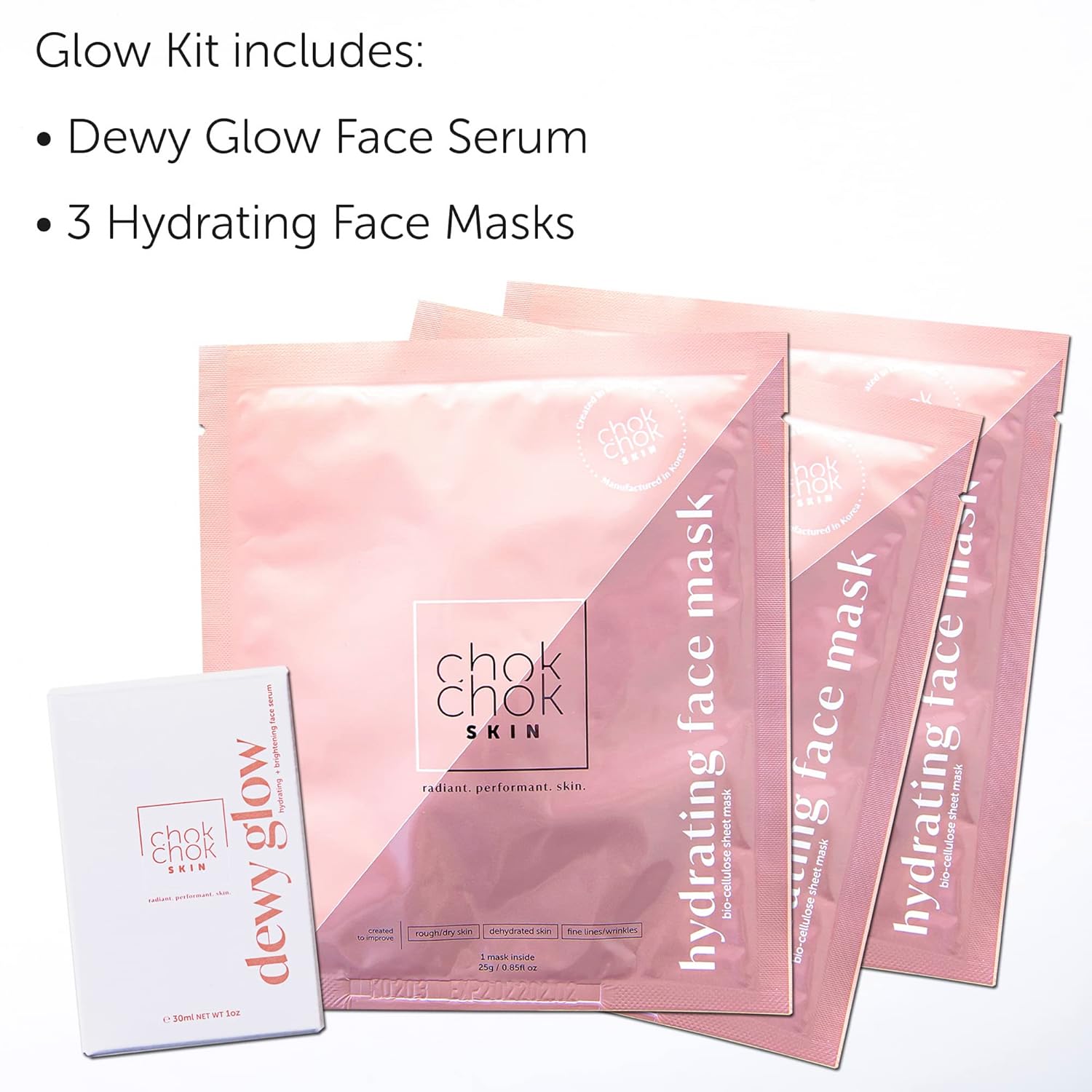 - THE PERFECT SKIN CARE PAIR: You get our Dewy Glow Hydrating+Brightening Face Serum and three Bio-Cellulose Hydrating Face Masks with Korean Medicinal Herbal Extracts
