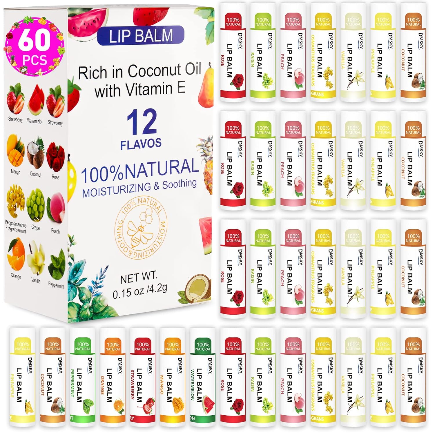 DMSKY 60 Pack Lip Balm, Natural Lip Balm Bulk with Vitamin E and Coconut Oil, Moisturizing Lip Balm for Chapped Lips, Bulk Lip Balm for Women-12 Flavors