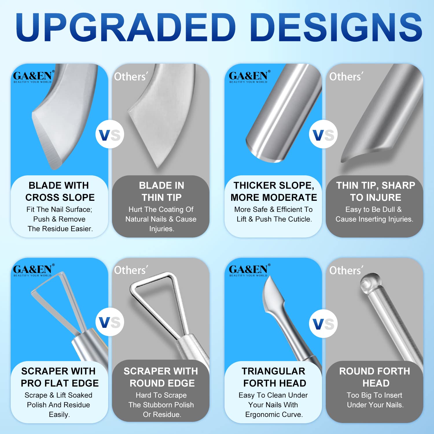 - FOUR WELL-DESIGNED HEADS: The spoon head is curved ergonomically with thicker slope, which avoids causing injury when pushing the cuticle. The triangular tip is made with thin and sharp edge, which can remove the gel polish cuticle easily and thoroughly with less scraping on nail bed. The curved-blade head is a good helper to clean up the residue along the cuticle line. The pointy head helps to remove the dead skin under your nails