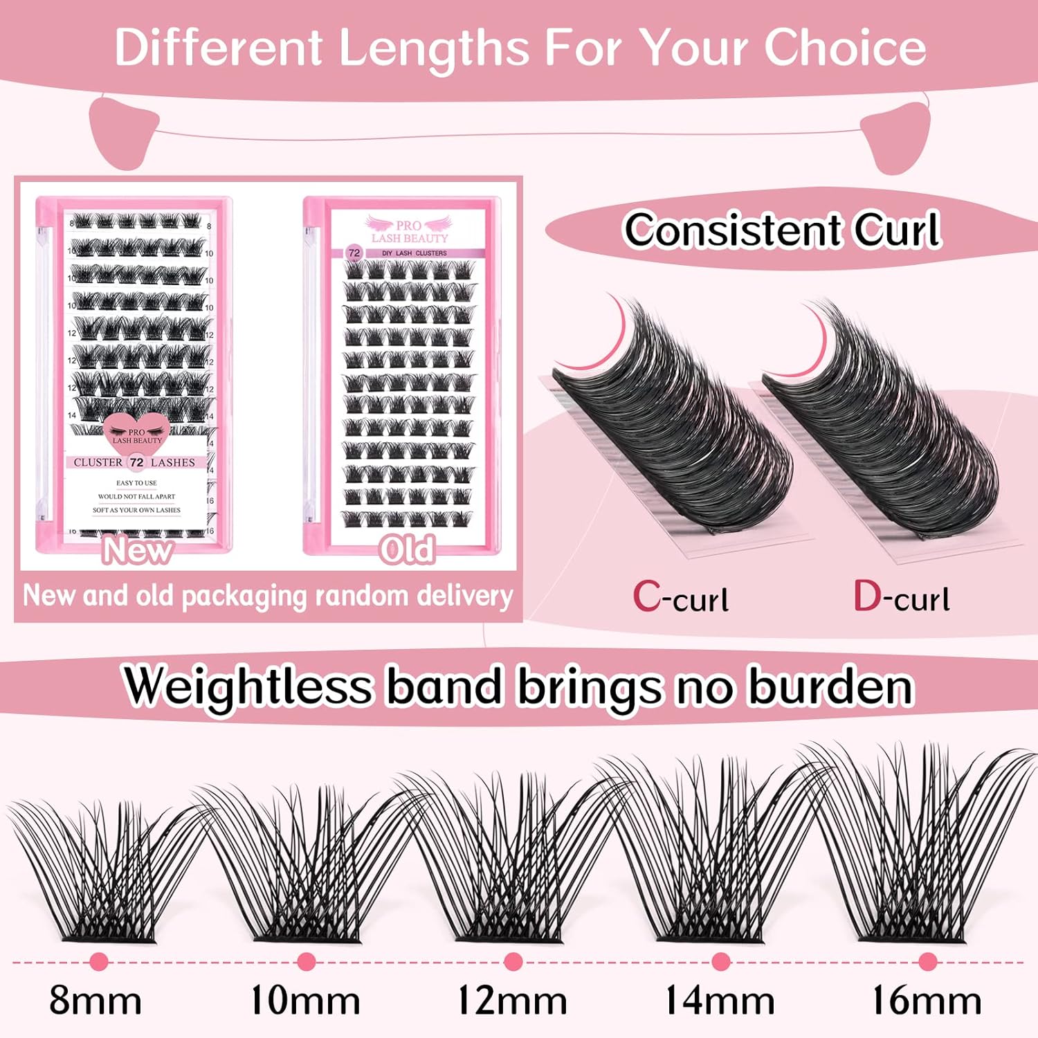 - 72 Pcs Cluster Lashes: The Cluster lashes are avaiable now! Different from other brands, PRO LashBeauty can provide 72 pcs in one tray! Mix Length from 8mm to 16mm. You can get more lashes and use more times.
