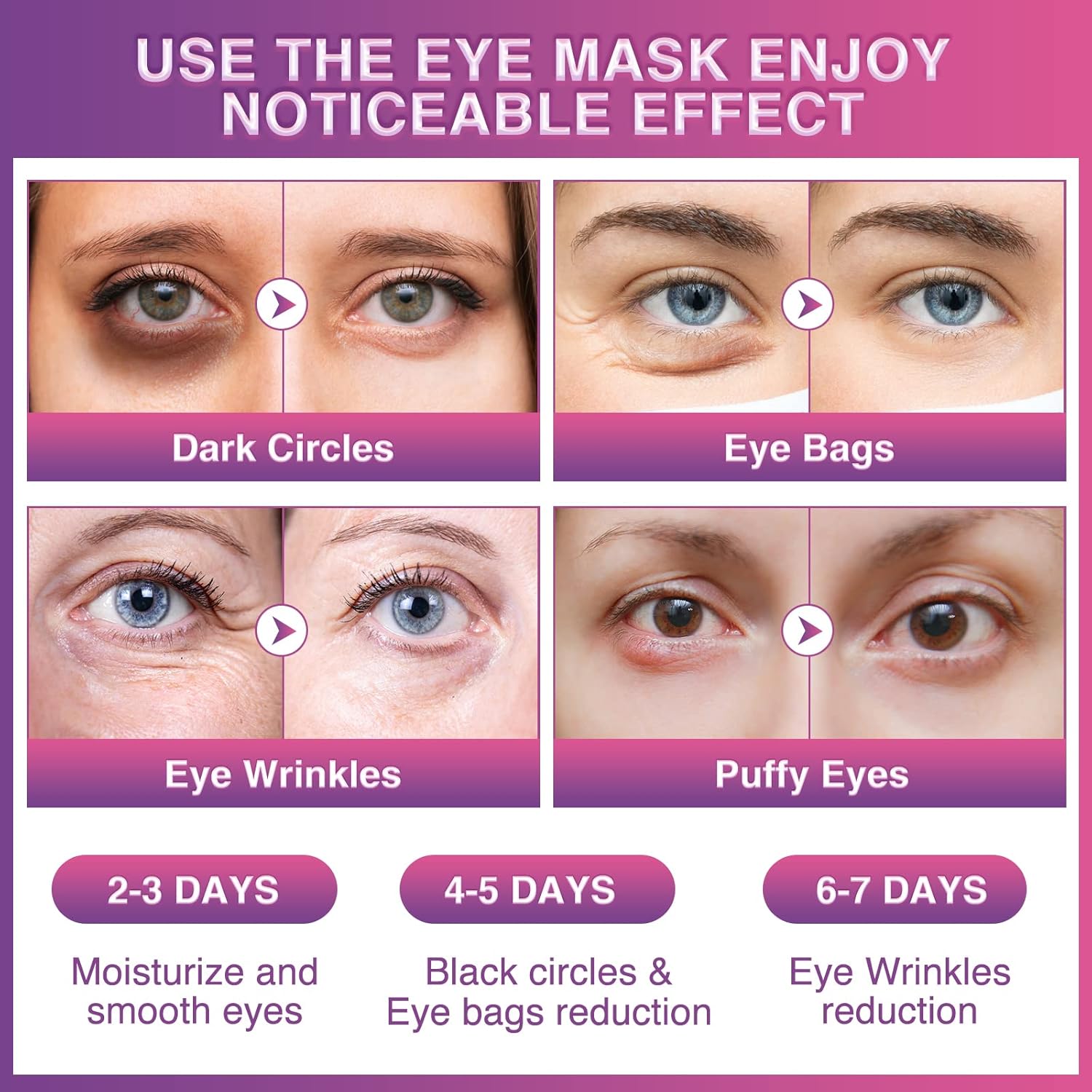 - 【Advanced Technology】The eye patches use innovative technology to achieve 98% one-way absorption rate. It can provide 10 times the moisture and nutrients of ordinary eye patches. Within 15 to 20 minutes, it will quickly repair and nourish your eye skin, effectively helping to relieve puffiness, dark circles, bags and fine lines,achieve anti-aging effect.