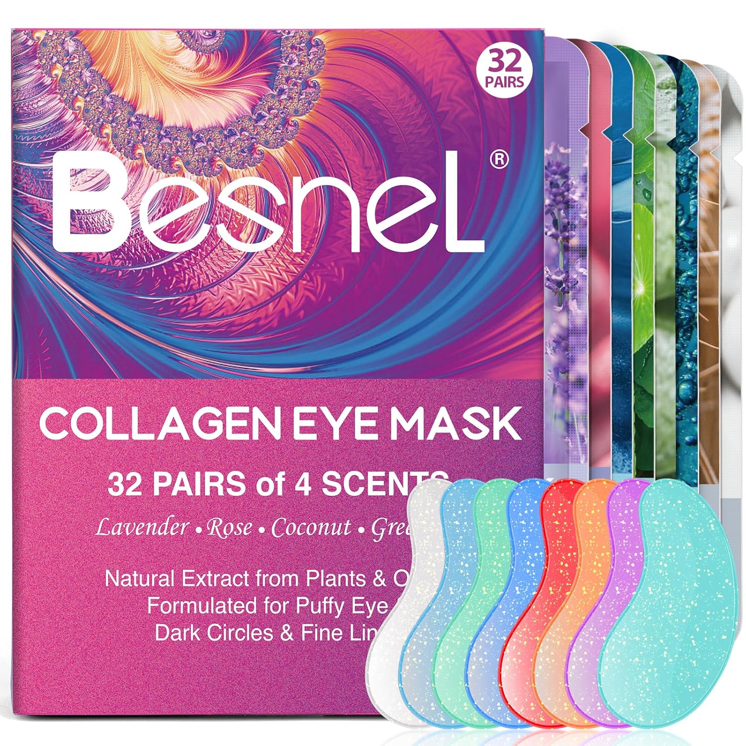 - 【Rich Content】The eye gels pack includes 32 pairs of eye masks to last for a few self-care nights!8 colors & 4 different scents make you feel refreshed, awake and youthful, while replenishing deep water for your eyes.The Hydrolyzed collagen released from eye patch penetrates deep into the base and lifts the eye contour ,improve eye fine grain and make the skin around the eyes hydrated and elastic from the inside out.