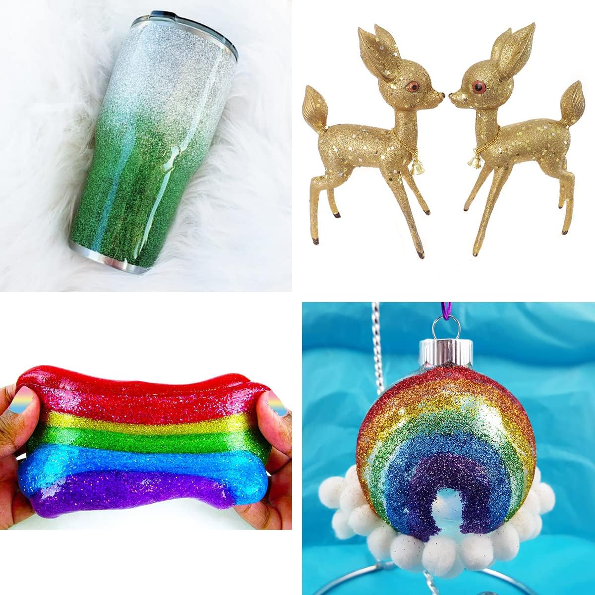 - 👉.Widely used and Plenty contents: Extra fine glitters can be used in craft making,resin ornament making,holiday decoration,resin jewelry making,epoxy resin tumbler,diy slime,nail art,body art,eye makeup,etc, and it can mix well with a gallon of paint and It sticks great with the paint.