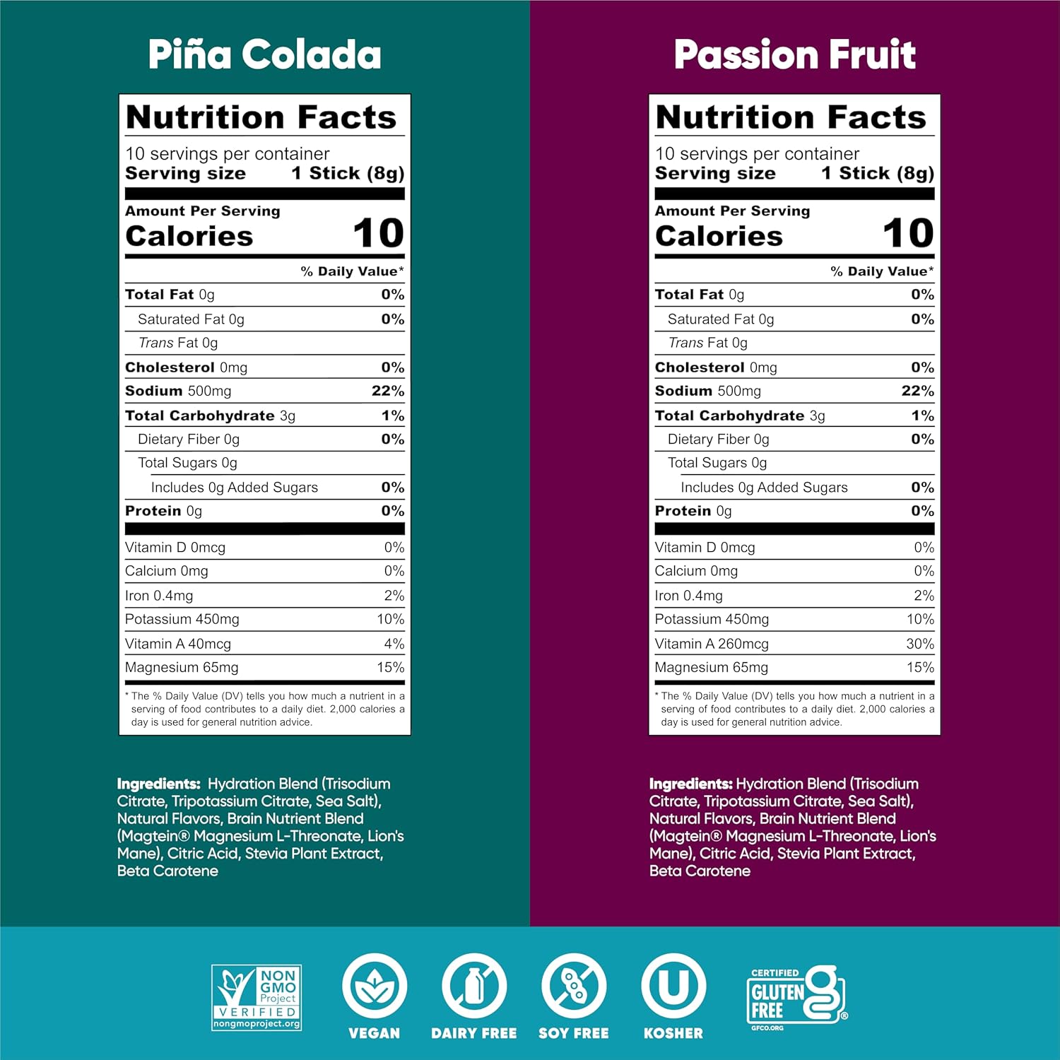 - DELICIOUS FLAVORS ON-THE-GO: Just mix one packet with 16oz of water for refreshing hydration anytime. Enjoy crave-worthy flavors like Blood Orange, Blueberry Pomegranate, Lemon Lime, Peach Mango, Raspberry Lemonade, Yuzu Mango, Iced Tea + Lemonade, Passion Fruit, Pina Colada, plus a convenient Variety Pack. A better-tasting, brain-boosting way to stay hydrated daily