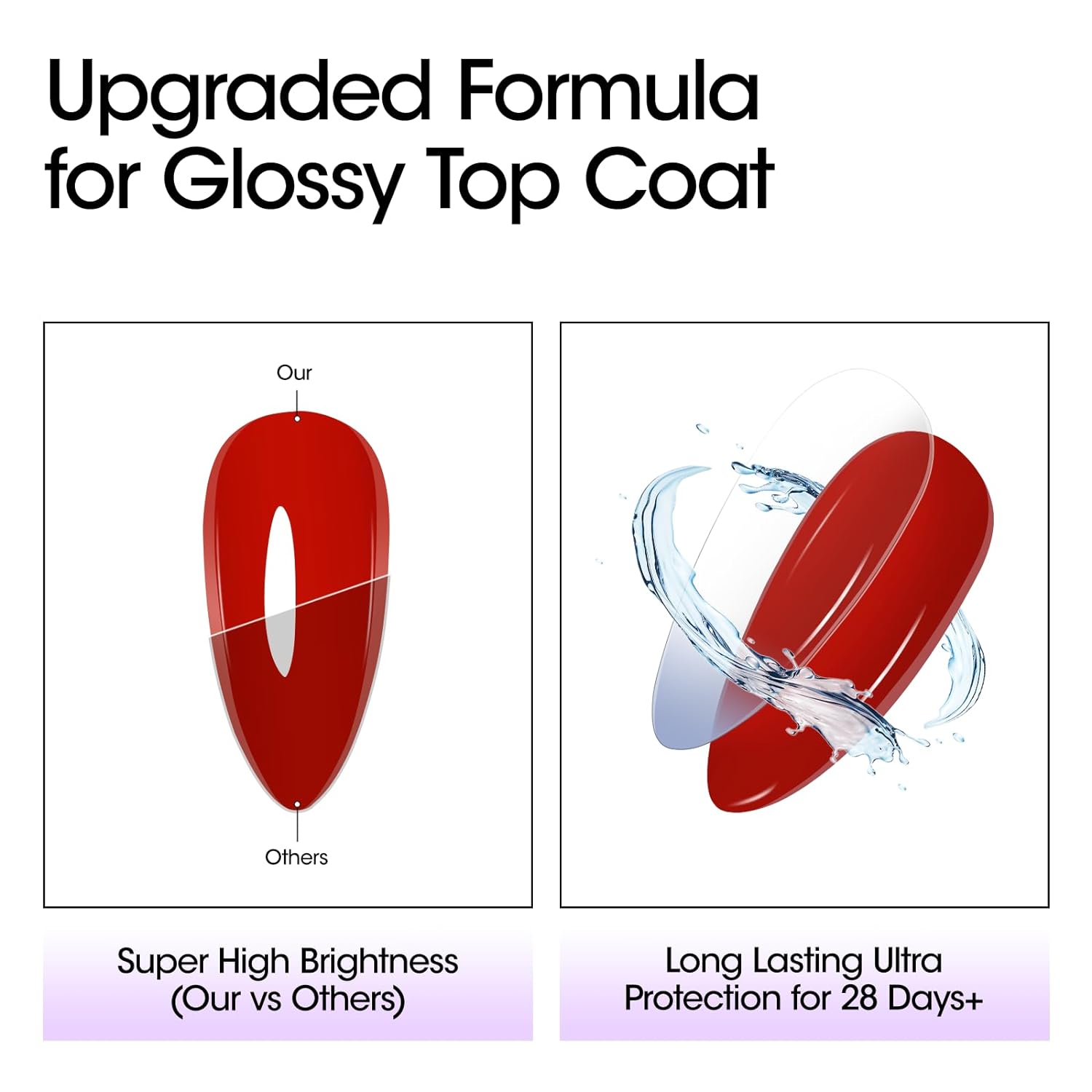 - Long Lasting for 28+ Days: With advanced formula, our Strong Base Coat prevents from peeling off and Glossy Top Coat provides ultra protection for your nails, avoids scratches or stains, and keeps a lasting gloss effect over 28 days under proper application (LED/UV lamp needed)