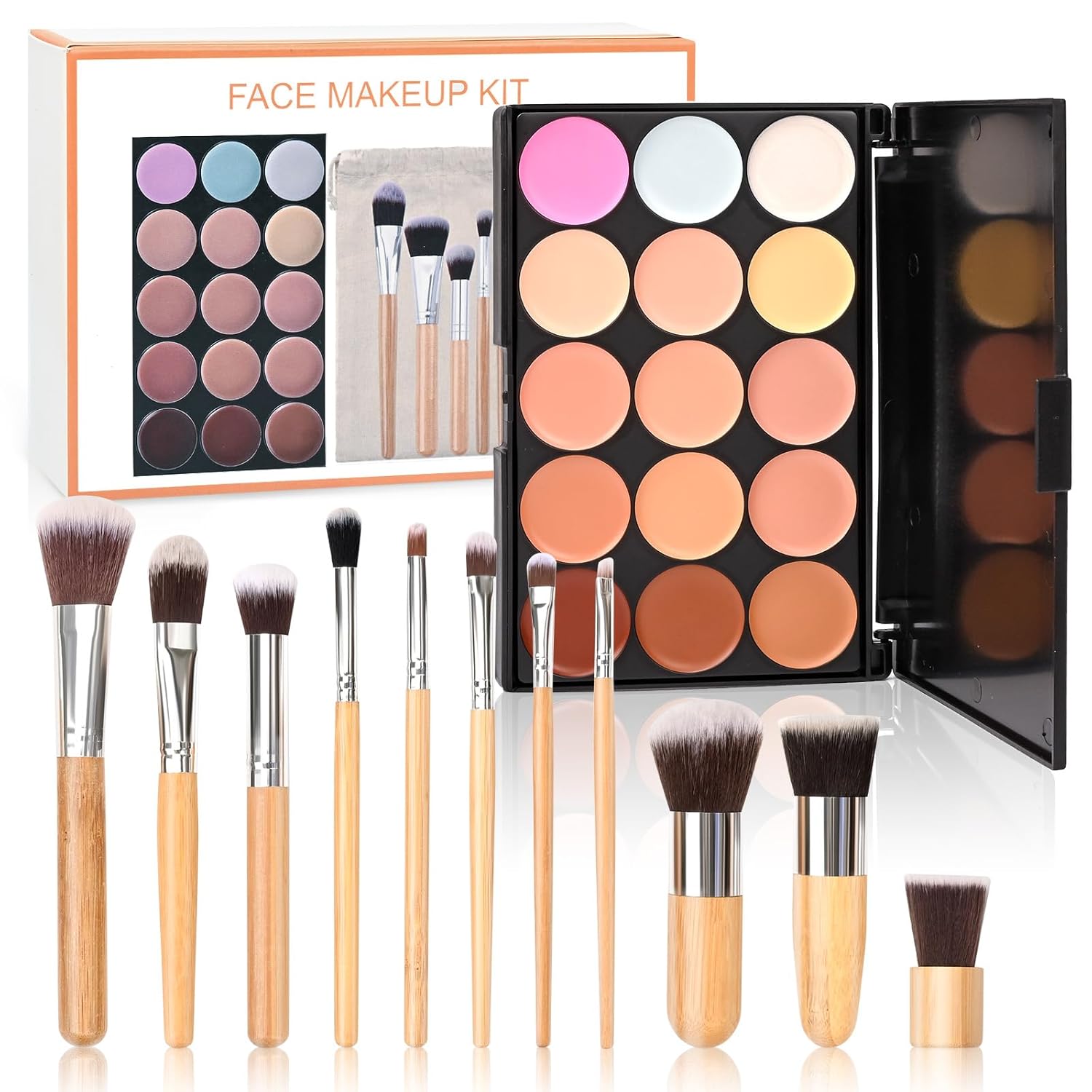 15 Colour Makeup Contour Palette Cream Kit, with 11 Pcs Complete Function Makeup Brushes Set and Storage Bag, Highlighting Light, Medium to Dark, Vegan & Cruelty Free