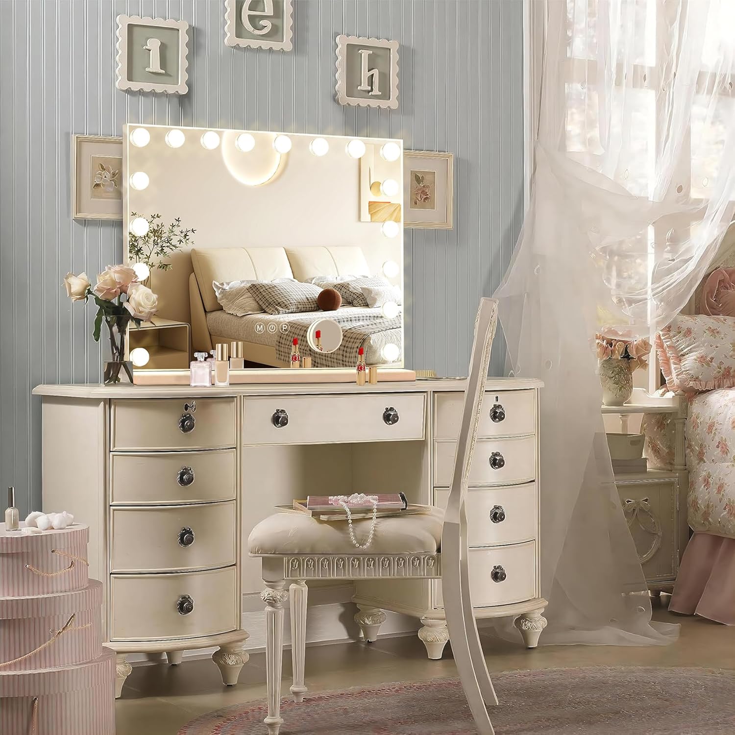 Hollywood Vanity Mirror with Lights, 18 Dimmable Bulbs, 3 Color Lights,Make Up Lighted Mirror, Aluminum Metal Frame, USB Charging Port(32" x 24")