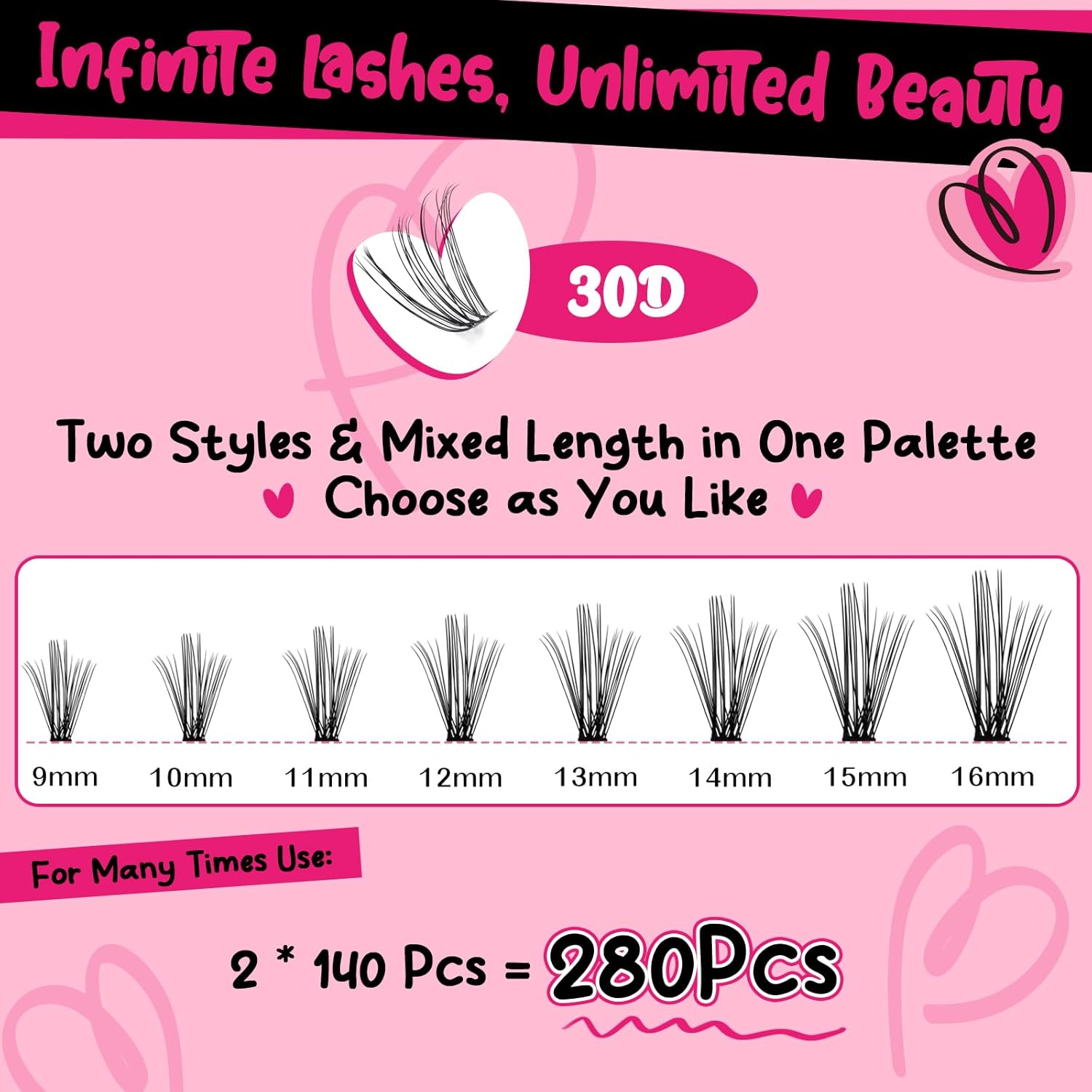 - 280 Individual Lashes: You can provide 280 lashes in one tray! The blended lengths range from 9mm to 16mm,D curl , and there are also have 30D+40D. With a variety of styles for you to choose from.