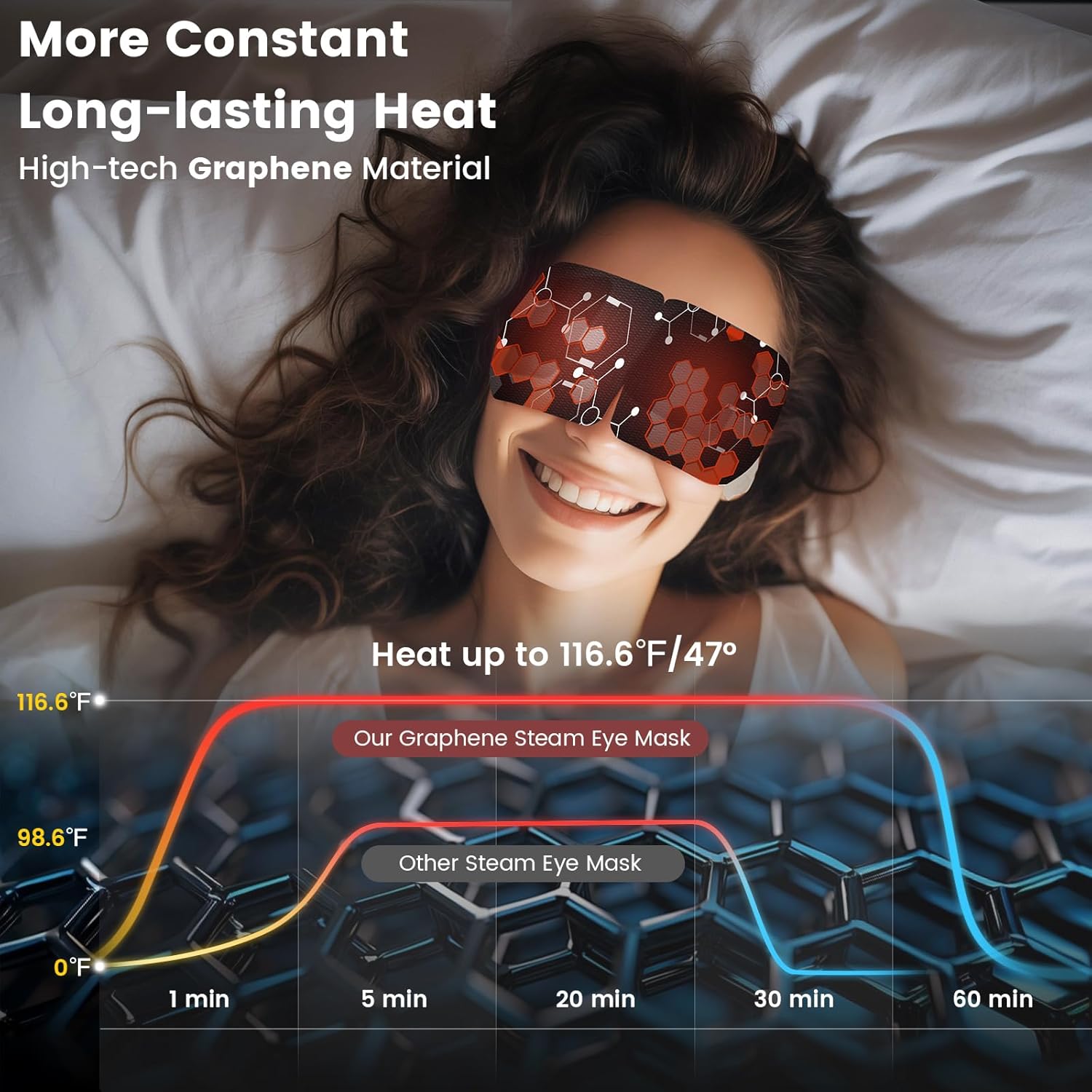 - Long-lasting Warmth for 40-60 Mins: Our dry eye mask utilizes advanced graphene material, ensuring consistent heating for 40-60 minutes. Compared to other steam eye masks, heated eye mask maintains a more durable and constant temperature. Graphene's unique high-temperature control evenly heats, preventing any risk of burning your eyes.