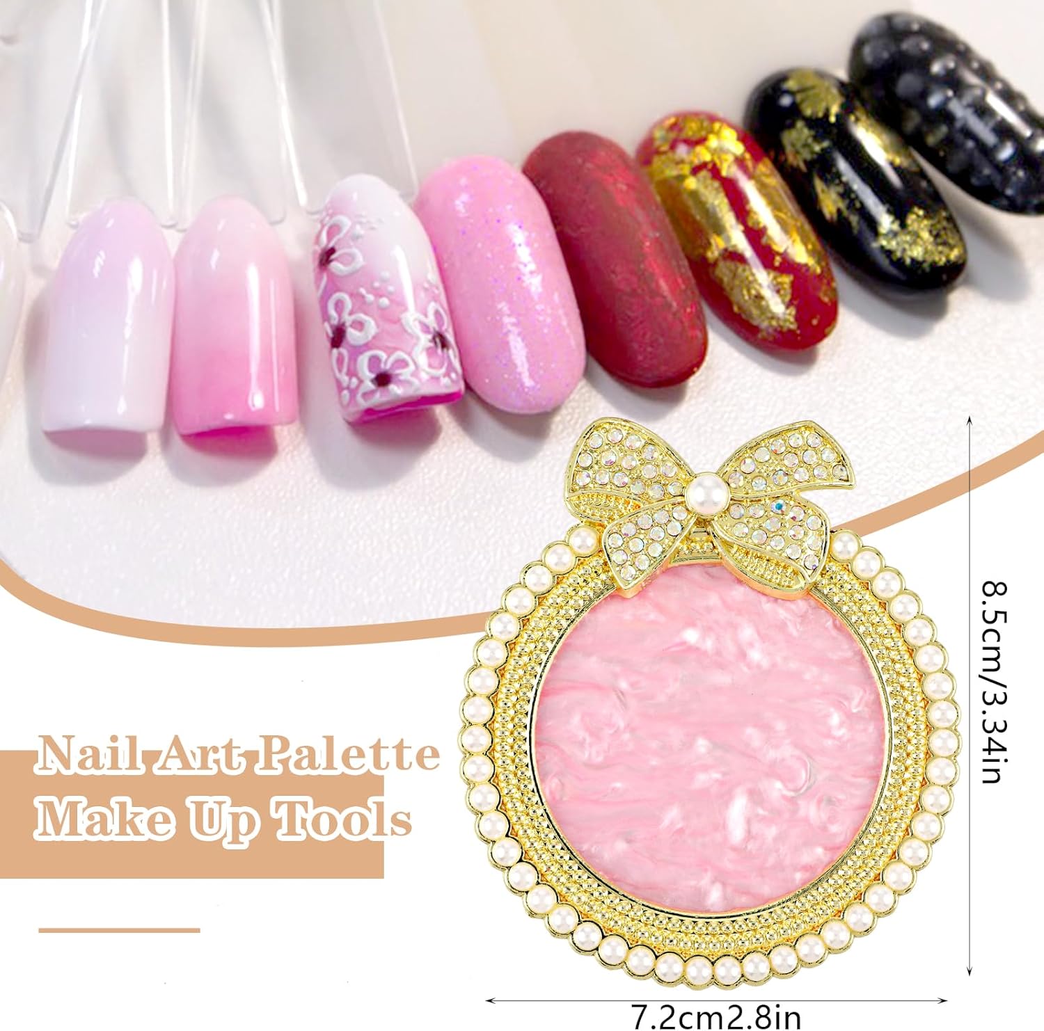 Resin Nail Art Palette, Nail Art Painting Mixed Color Palette Bow Decorated Nail Art Display Board with Pearls Nail Art Supplies Makeup Foundation Mixing Palette Manicure Tool