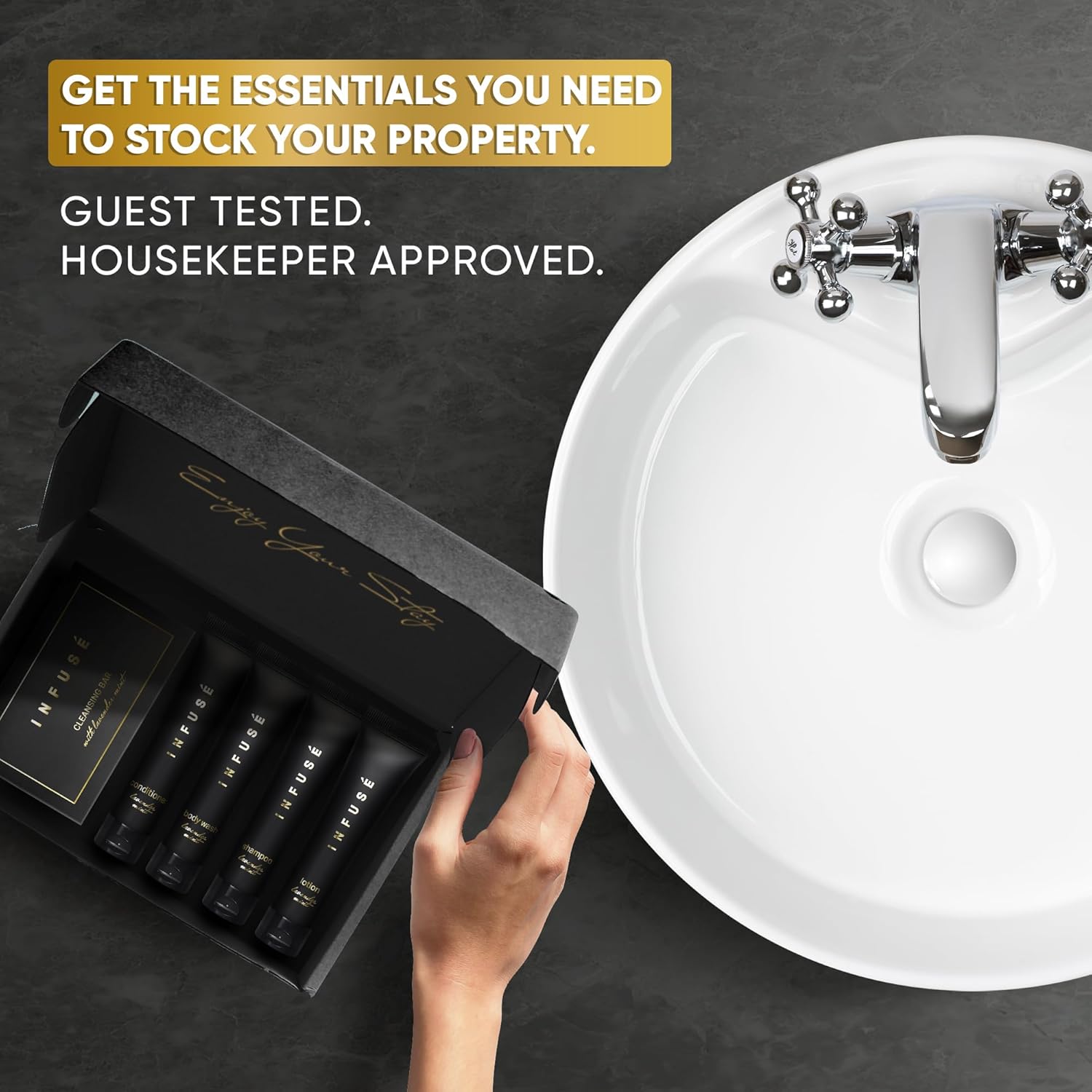 - WHY CHOOSE INFUSE BLACK? Our high-end formula & environmentally friendly beautiful design bring elegance to any upscale rental or vacation property. Our travel size, pump, and gallon toiletries are paraben-free, gluten-free & made with lavender mint for soft skin & hair! We offer a range of products and cater to all your on-the-go personal care needs.