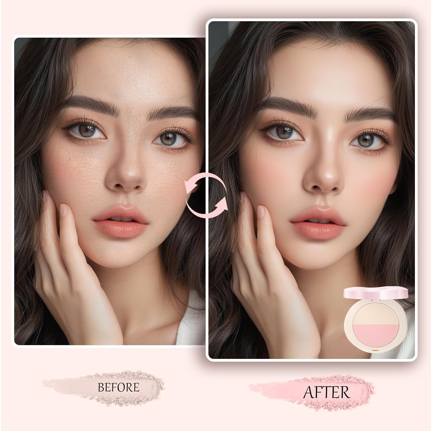- 【Versatile Dual-Shade Palette】Introducing our dual-shade palette, a perfect blend of blush and highlighter in a single compact. One side brightens your natural glow, while the other adds subtle radiance. Plus, mix the two shades with our brush to use as a setting powder, offering a convenient three-in-one beauty solution.