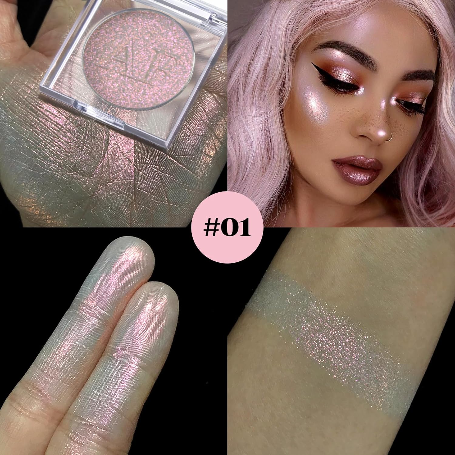 Highlighter Makeup Palette, Long Lasting New Formula, Fairy-like Sheer Glow, Translucent Pink and Silver Shimmer, Ideal for Face and Body Contour and Cheek Highlight,#1