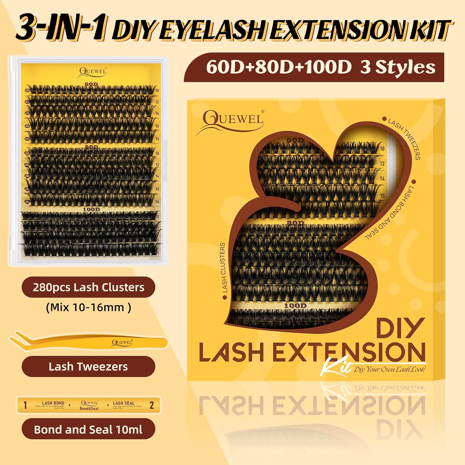 - DIY Lash Extension Kit: QUEWEL lash clusters kit includes 280pcs 60D+80D+100D eyelash clusters, 1*10ml lash bond and seal, and 1* eye lashes tweezers. This lash clusters kit can meet your needs and make your eyes more attractive, whether it's for everyday makeup or special occasions, this three-piece eyelash extension kit will make you shine outstandingly