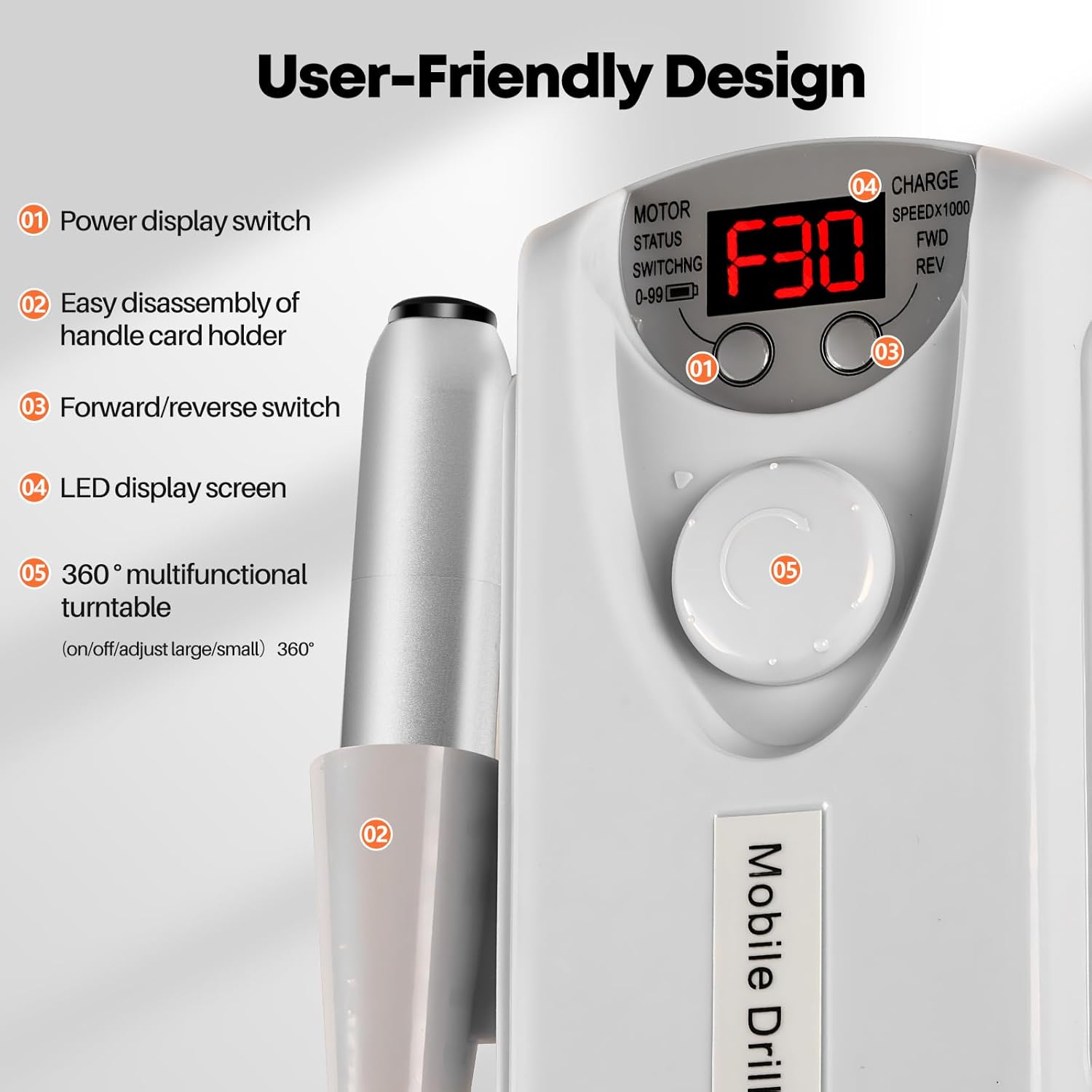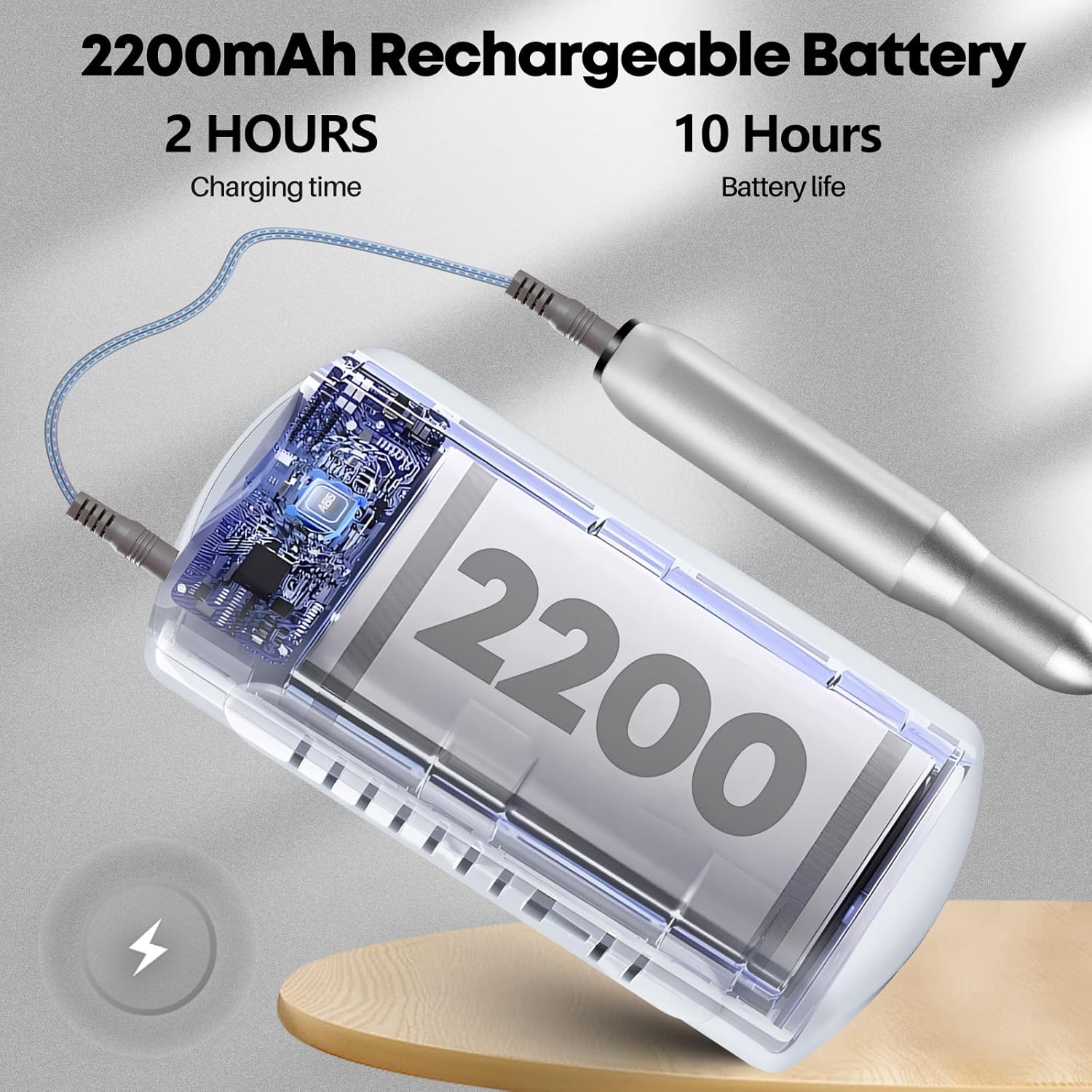 - 10 Hours Cordless Work Time: Our rechargeable nail drill is built in large capacity battery 2200 mAh, which fully charge for 2-3 hours could support to run for up to 10 hours. You could do your nails anytime without worrying about running out of power. Ideal for busy salon environments or long at-home nail treatments, ensuring consistent, reliable performance every time