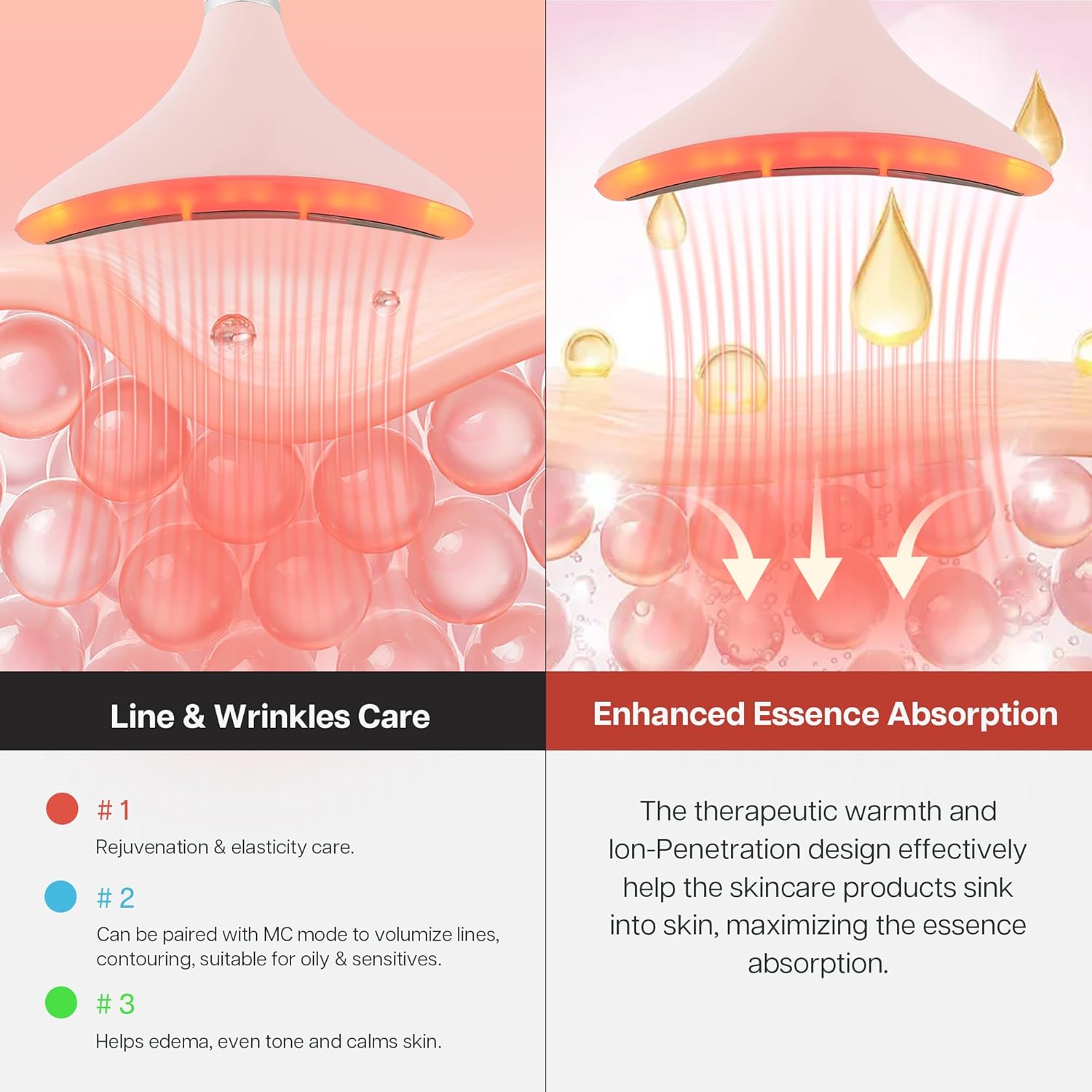 - 【Overall Care Device】 This all-in-one device combines MC mode, Triple-Action Care and Thermal to enhance absorption, radiance, and for different skincare concerns. For a personalized session, the MC mode (the waveform symbol indicator) can be switched off/on by double-clicking the universal button, and mircro-vibration activates only when the massage head touches the skin.