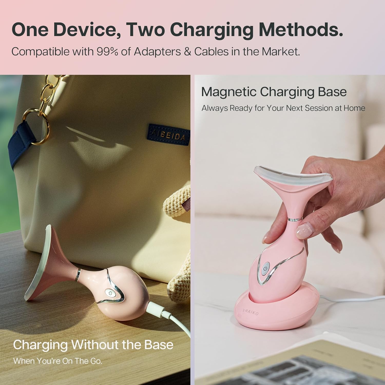 - 【Travel Friendly Design】 One Device, Two Charging methods. The VRAIKO Iris offers versatile charging options to suit your lifestyle. At home, the magnetic charging base keeps your space tidy while ensuring the device is always ready for your next skincare session. When you’re on the go, whether traveling for vacation or business, the compact device can be conveniently charged via any USB-C cable, without the need for the base. Compatible with both fast and slow chargers, it ensures an effortless skincare routine, wherever you are, without the hassle of extra cables.
