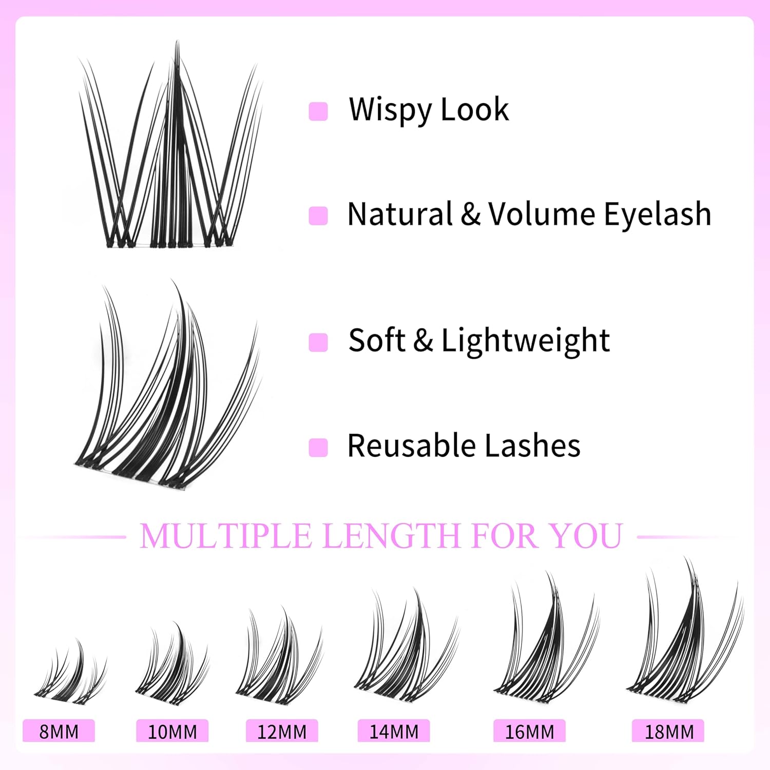 VEYESBEAUTY Lash Clusters Kit Eyelash Extensions Thin & Invisible Band DIY Individual False Eyelashes Newbie's Five-Second Series Wispy Lash Tray for Self-application, Manga Lash 8-18mm Mixed Length