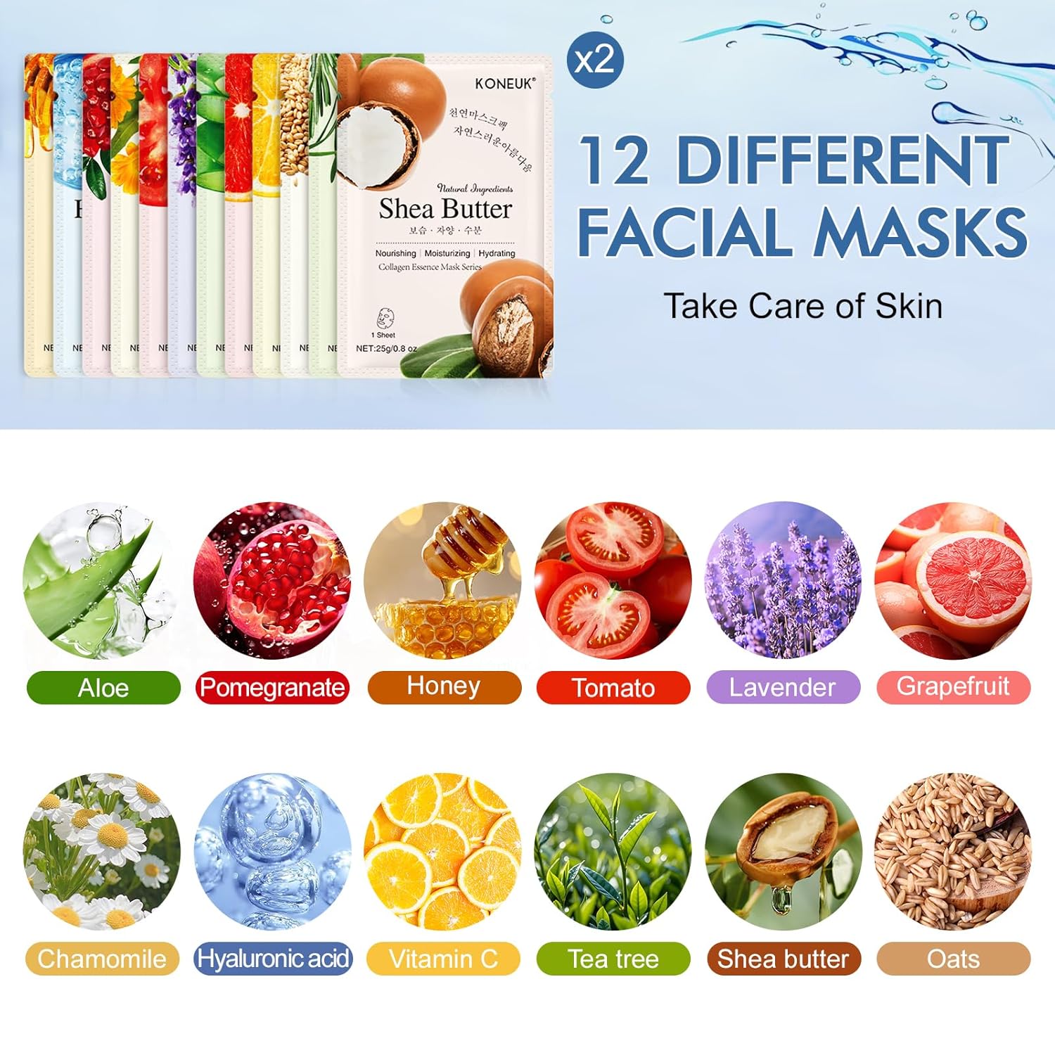 24 Pack Sheet Face Masks Skincare for Women, Hydrating Collagen Essence Face Masks Suitable for All Skin Types, Face Mask Gifts Set for Spa Party, Bulk Facial Masks for Women Skin Care