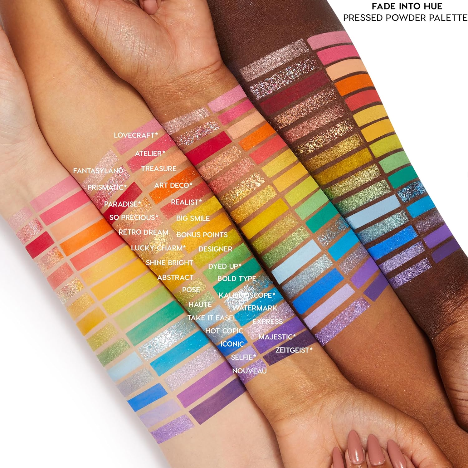 - Fade Into Hue - We finally did it, our rainbow mega palette is here! This fantasyland of abstract colours features a mixture of sparkling Metallics, blinged-out Pressed Glitters, and the richest Mattes that apply evenly and blend like a dream. One palette can really do it all.