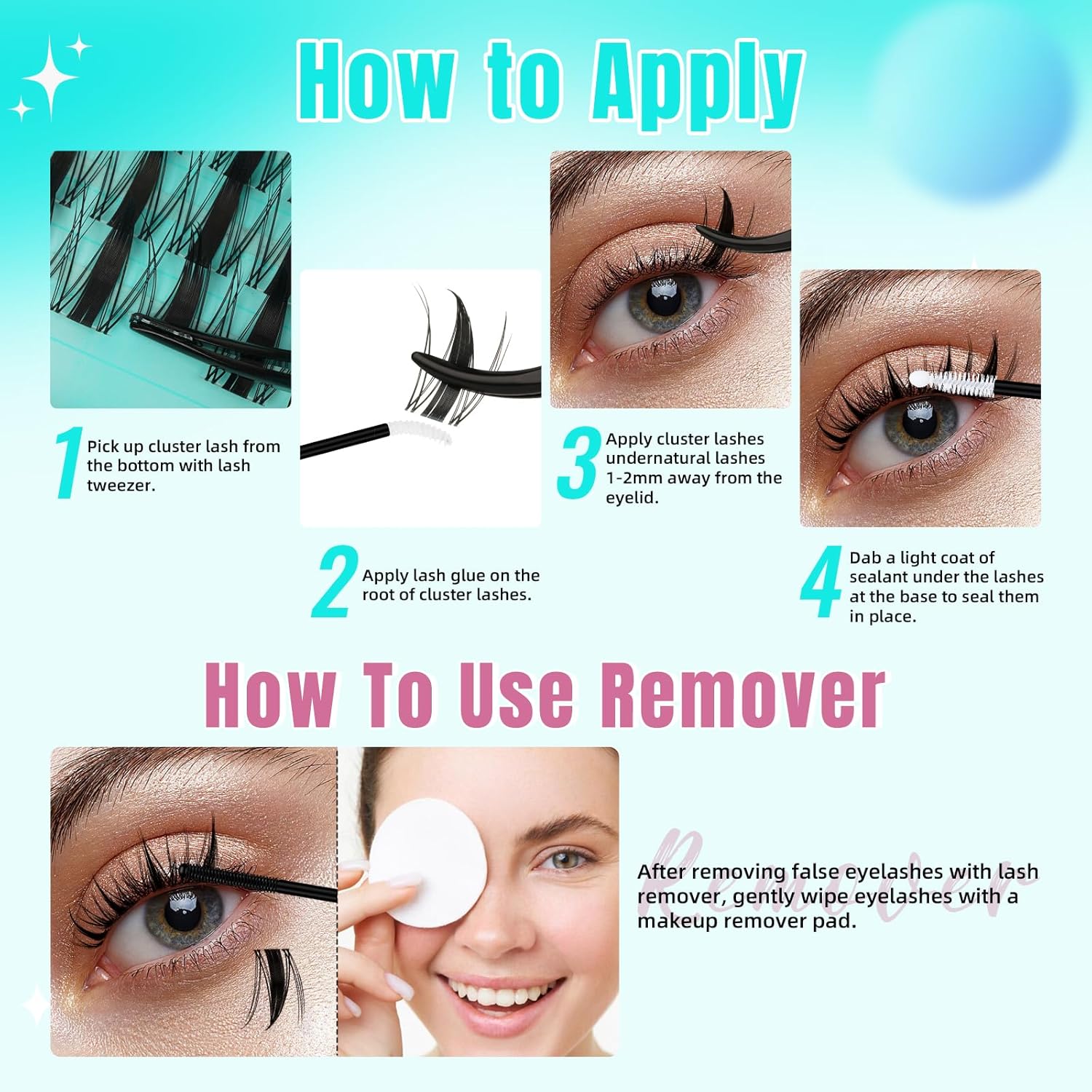 - PERFECT LASH EXTENSION KIT: Manga lash clusters kit has 144pcs anime lash clusters with invisible lash band, waterproof black lash bond and transparent seal* 1, lash tweezer* 1 and lash remover* 1. The fairy lash kit has different eyelash length options, and is suitable for those who want to choose from different fairy eyelash style.