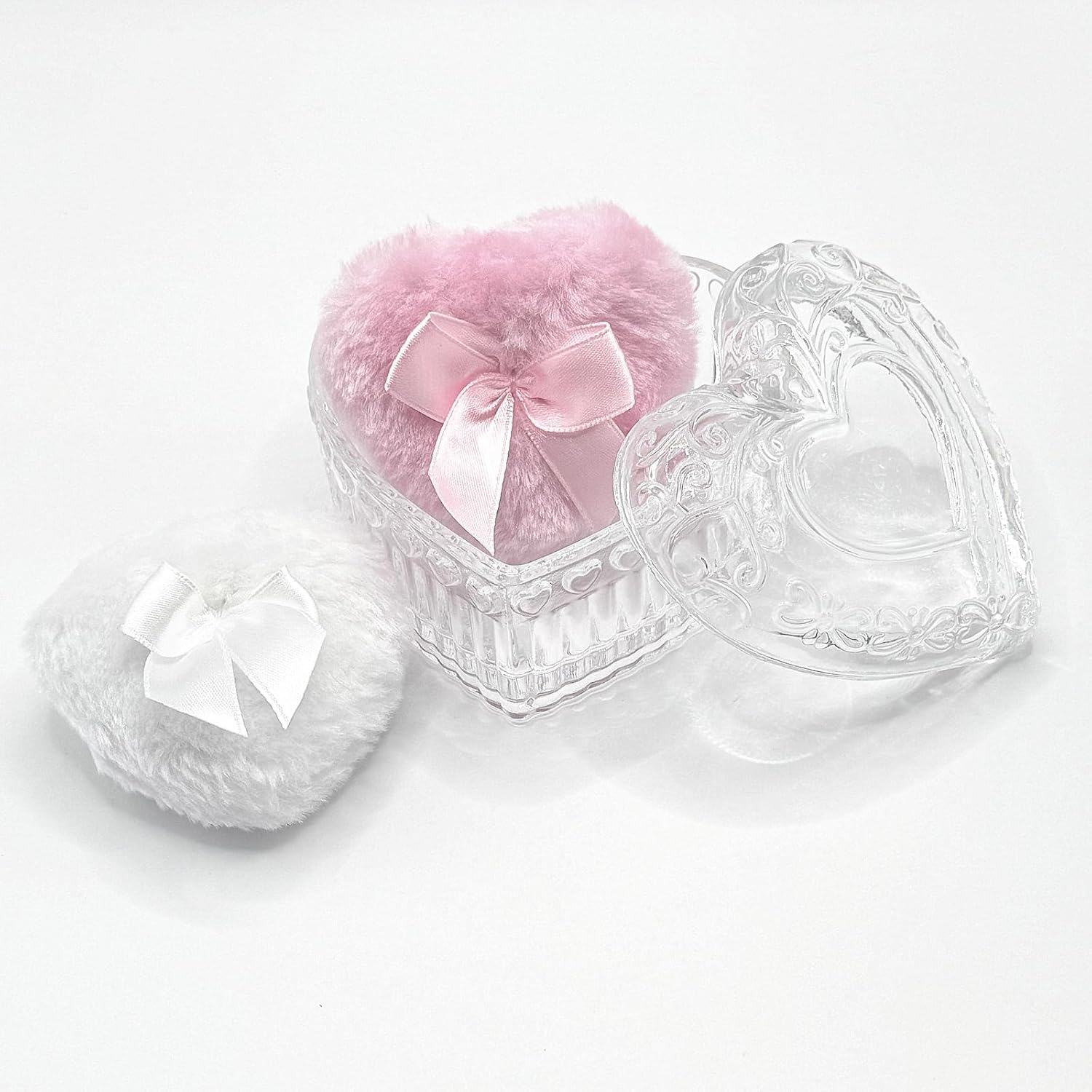 - PACKAGE INCLUDES 1 x Heart Shaped Glass Powder Puff Box with Reusable White and One Pink Puff Transparent glass material with heart shaped design, both aesthetics and ritual, suitable for gifts or makeup table decorations. The tassel is soft and reusable, can be used wet and dry