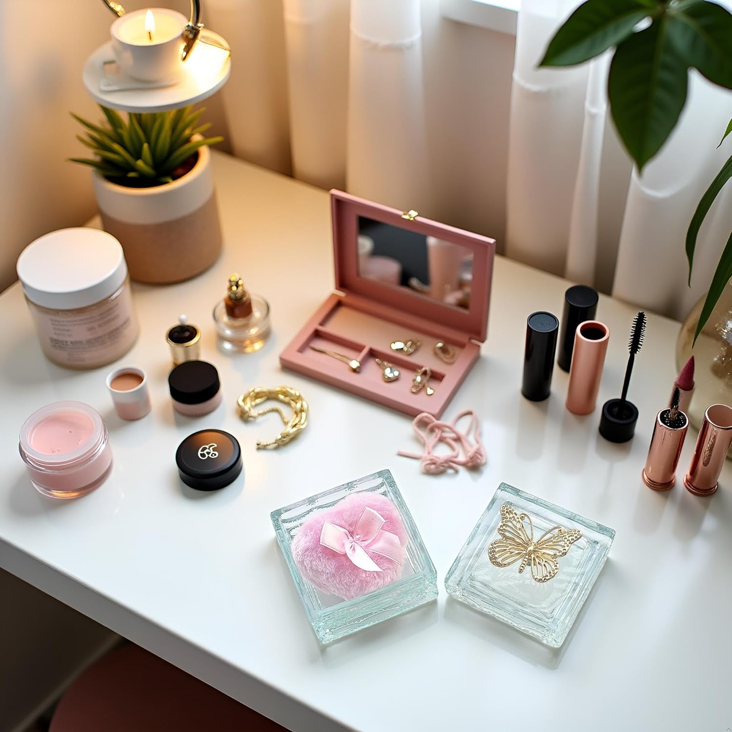 - 【Unique Design】This classic glass powder puff case has delicate and lovely beautiful embossed pattern and gold butterfly decorations, which makes you shine, the powder puff case measures 3.23 inches L x 3.23 inches W x 2.95 inches H, designed for dresser storage and decoration.