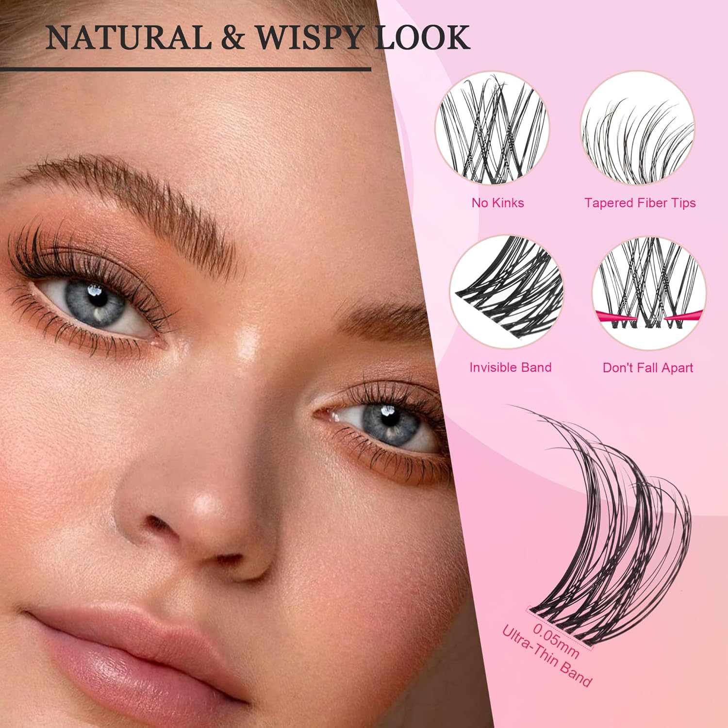 - 【Updated Premium Light-Weight & Cloud-soft Fibers】Adopt updated premium simulation materials and innovative technology, the ultra-soft fibers with 0.07mm memory rebound technology maintain a stable curl without kinking, providing a wispy eyelashes natural look that is indistinguishable from real lashes, lightweight, non-feeling, and naturally comfortable.Hugs (0.07mm tapered tips) featherweight fan shapes,weight reduction by 35% prevents premature drooping.