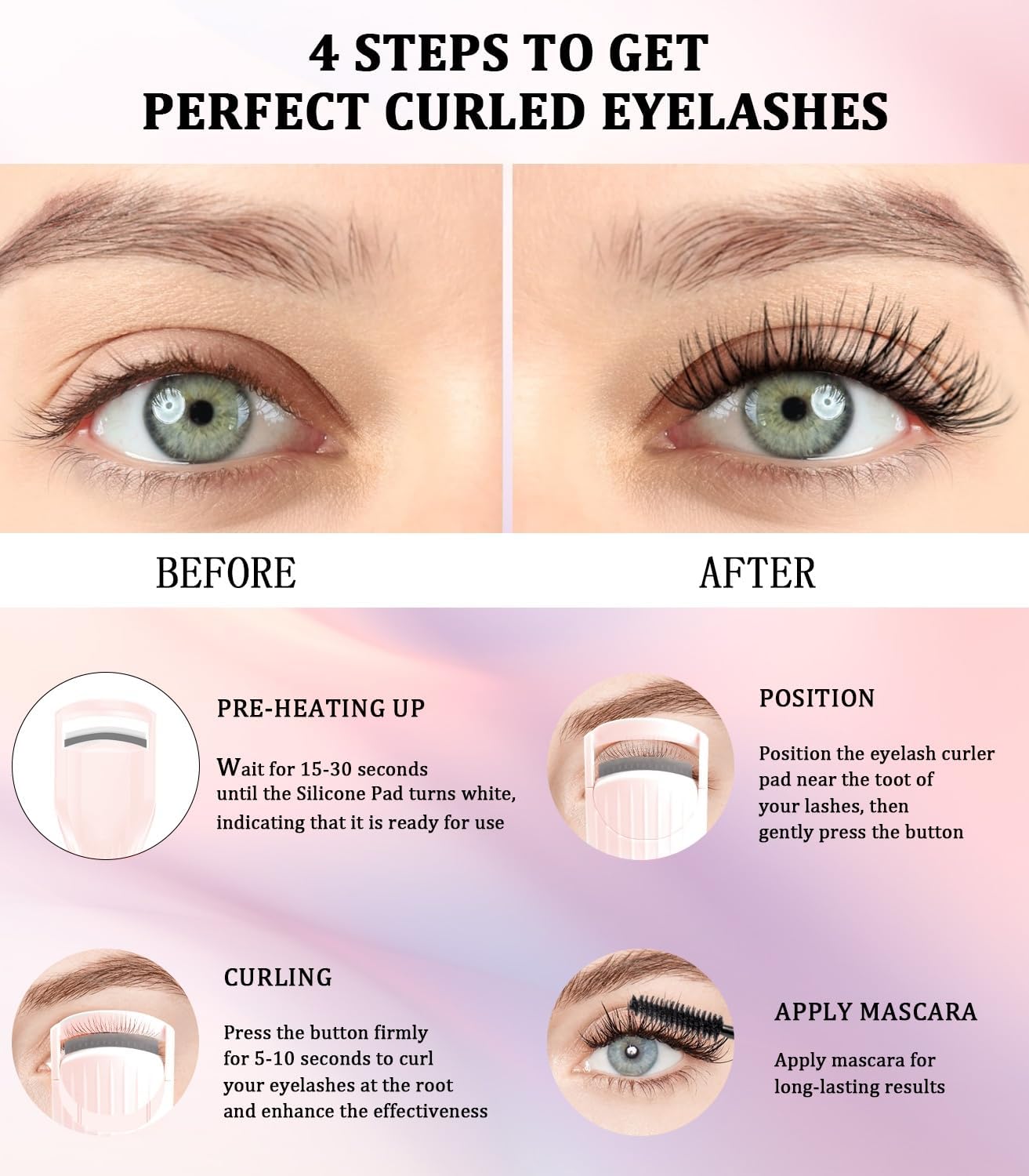 - 10s Fast Heating & Long-lasting Curl: The eye lash curler heats up in 10s. Its curved silicone design, used with mascara, separates lashes for a natural look. Achieve a deep, natural curl lasting 24 hours, enhancing your eyes effortlessly