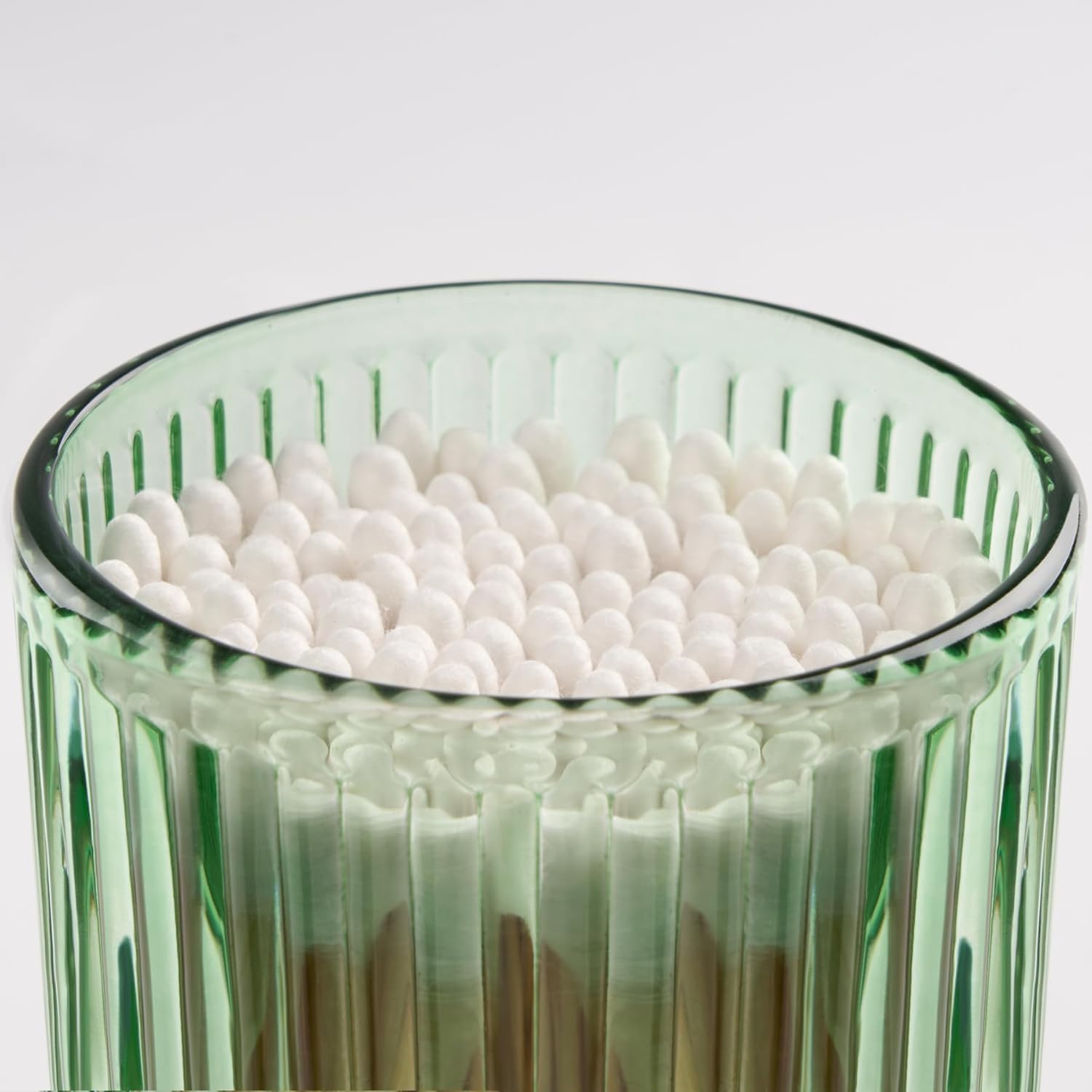 - Elegant Bathroom Organizer & Storage -Introducing our 9.8oz (3.9 x 3.5 inch) glass qtip holder with lid. Perfect for storing cotton swabs, cotton balls, cotton pads, bath salts, floss picks, hair tiesand more. This stylish and versatile bathroom accessory keeps your vanity, countertop, or dresserneat while adding a modern touch to your home décor. ldeal for bathroom, dorm, bedroomkitchen, or office organization. Available in multiple colors to match any style